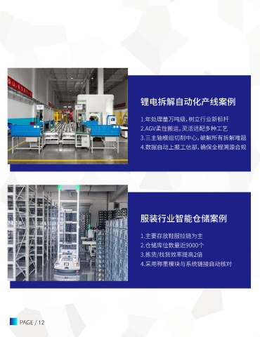 锂电拆解自动化产线案例 1.年处理量万吨级,树立行业新标杆 2.AGV柔性搬运,灵活适配多种工艺 3.三主轴模组切削中心,破解所有拆解难题 4.数据自动上报工信部,确保全程溯源合规 服装行业智能仓储案例 1.主要存放鞋服拉链为主 2.仓储库位数量近9000个 3.拣货/找货效率提高2倍 4.采用称重模块与系统链接自动核对 PAGE / 12