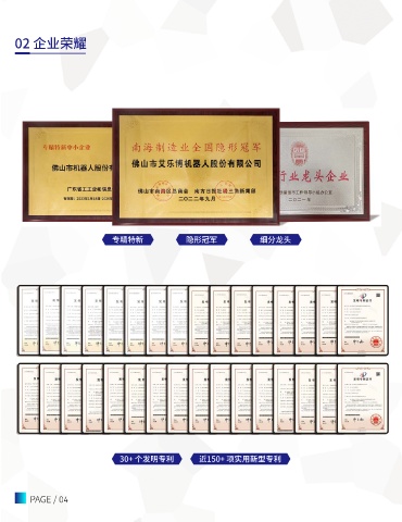 02 企业荣耀 专精特新 隐形冠军 细分龙头 30+ 个发明专利 近150+ 项实用新型专利 PAGE / 04