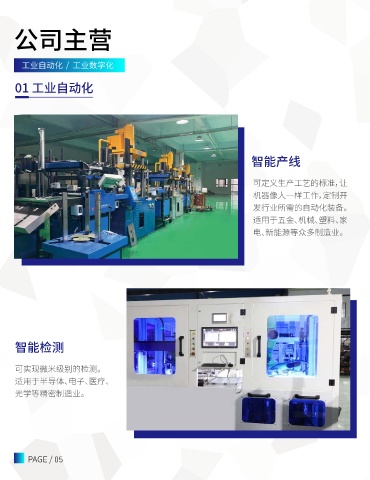 公司主营 工业自动化 / 工业数字化 01 工业自动化 智能产线 可定义生产工艺的标准,让 机器像人一样工作,定制开 发行业所需的自动化装备。 适用于五金、机械、塑料、家 电、新能源等众多制造业。 智能检测 可实现微米级别的检测。 适用于半导体、电子、医疗、 光学等精密制造业。 PAGE / 05