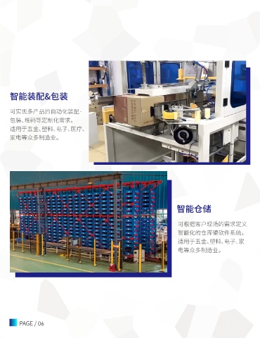 智能装配&包装 DIRECTORY 可实现多产品的自动化装配· 包装、堆码等定制化需求。 适用于五金、塑料、电子、医疗、 家电等众多制造业。 智能仓储 可根据客户现场的需求定义 智能化的仓库硬软件系统。 适用于五金、塑料、电子、家 电等众多制造业。 PAGE / 06